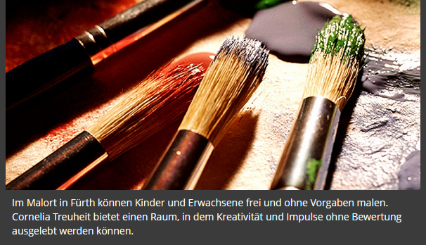 Der Malort in Fürth ist ein großzügiger, drei Meter hoher Raum, speziell so eingerichtet, dass zum Malen alles vorhanden ist. Ein sorgfältiger und zugleich einfacher Umgang mit allen Materialien bestimmen das Geschehen im Malort Fürth.